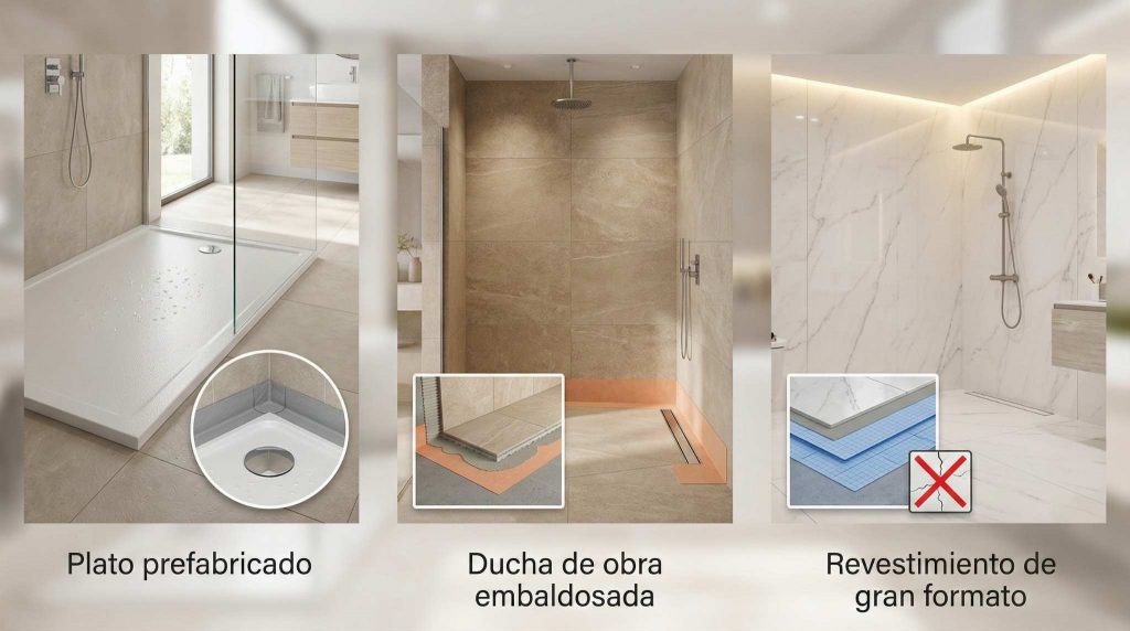 Implementa lámina o sistema líquido en suelo y paredes a altura suficiente, con pendiente hacia un desagüe compatible (lineal o punto) y piezas para esquinas/pasos. Los kits de ducha simplifican la compatibilidad de todos los puntos singulares. - Revestimientos grandes (porcelánico de gran formato):
