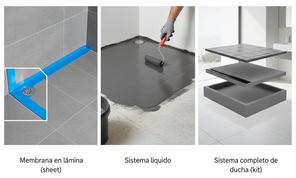 Lámina continua (p. ej., polietileno) que se adhiere bajo el revestimiento. Incluye piezas para esquinas, pasos de tubería y encuentro con desagüe. Muy usada en duchas de obra y platos embaldosados. - Sistemas líquidos (membranas cementosas o resinas líquidas)